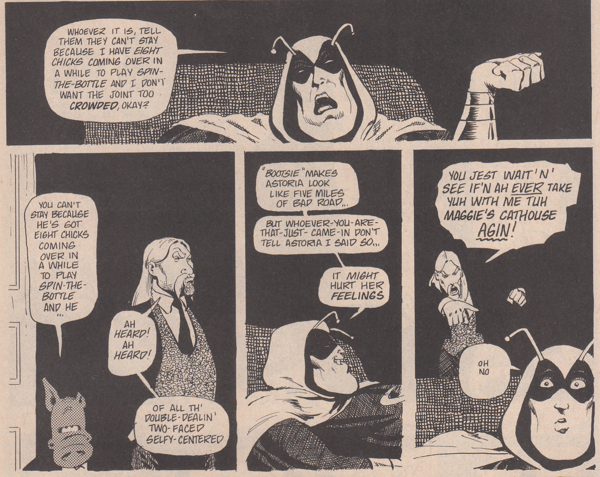 A few other bits of intrigue take place this issue too. The "duck statue" comes back into play. Everybody seems to realize it's important but, as of yet, nobody really knows why. It was just a stupid throw away line a while back when Cerebus's ransom was never paid and instead it was replaced by statue of a duck. But the duck has been lost now and Moon Roach is searching for it because of the other bit of intrigue. Moon Roach has discovered that Astoria doesn't love him. Duh. She doesn't love anybody, bug! He thinks she loves Cerebus but she just wants the power Cerebus can bring them. Also she's fucking Dirty Drew because who isn't? Apparently he's the hottest dude in Estarcion and he really knows how to please the ladies! He doesn't even need to give them a statue of a duck.