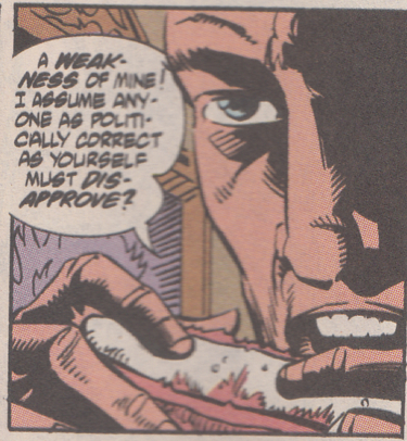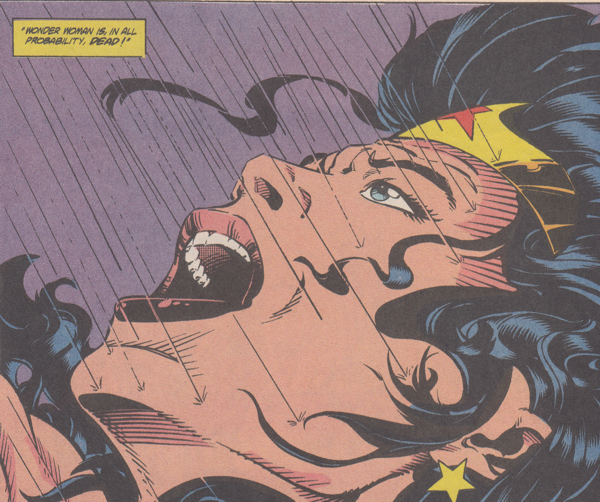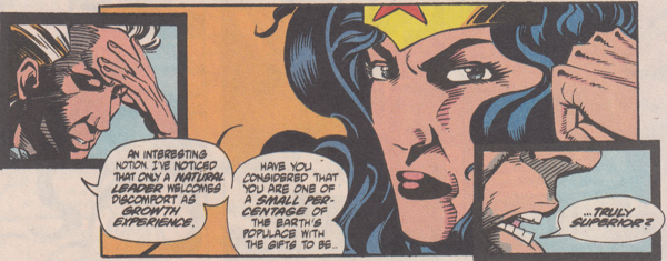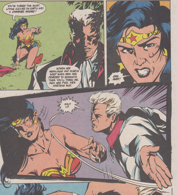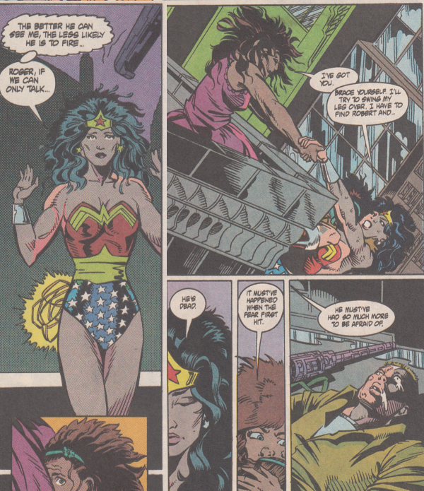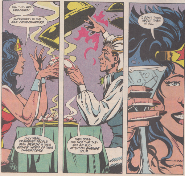 • Wonder Woman takes a few shots to the wrist bracelets and everybody around her is all, "He's a lone gunman! Being a white man, he's the only one responsible for his actions! He doesn't represent his entire race in the same way society demands anybody of a minority group represents the entire group!" Except it couldn't be that explicit, right? Because this is 1992 and according to Comics Gaters, comics only went woke in this millennium. Right?