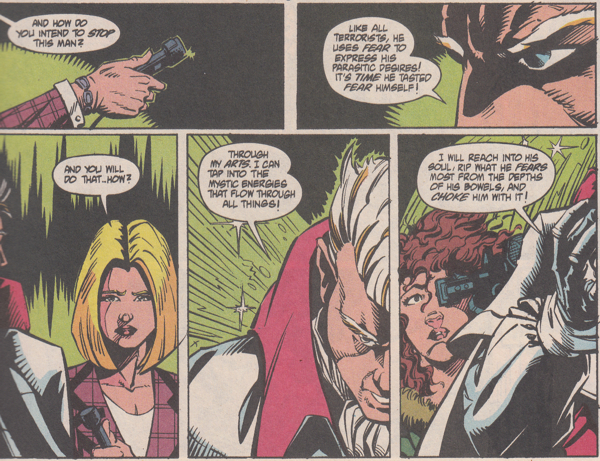 • Some guy named The White Magician shows up and, well, even in 1992, I'd maybe have thought twice about that name. He wears white and has white hair but he also has what is colloquially thought of as "white" skin so, you know, maybe that name is saying more than you actually want it to say? Because "white", especially in 1992, was the society accepted neutral position³ which meant if the person's "race"⁴ wasn't mentioned, one would assume "white". If you have to go above and beyond to express your "whiteness" or your "Defender of Western Civilization" status⁵, you're probably making a bigger statement than just the color of your costume and hair.