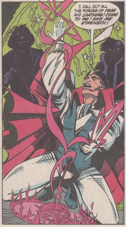 • The White Magician spends a full page or more invoking all sorts of DC magics that I've never heard of before. Zatanna could have saved the day with a couple of backwards words. Madame Xanadu could have wrapped this shit up by manipulating a bunch of actual heroes in no time at all. But this guy is doing the equivalent of a Great White guitar solo in a small club.