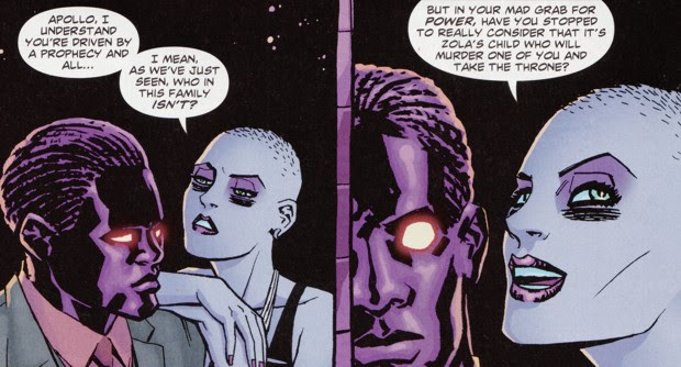 While Diana and Zola are fifty stories below the picture, Apollo sits upon the throne. Hera doesn't try to stop him because she believes Zeus is too much of a narcissistic God to not exist. And she believes that in no way will he allow someone else to take his throne. When Apollo sits and Olympus shakes, Hera believes Zeus has returned. But the shaking is merely Olympus reforming to represent the aesthetic of its new master.