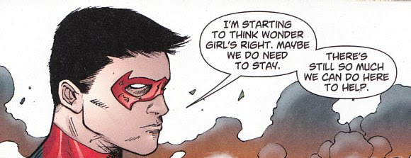 Superboy convinces the Titans to leave because their time in the DC Universe is short. I guess they'll be leaving Kid Flash and Solstice behind because the law says so and Red Robin must adhere to the letter of the law! Hopefully they've now left this comic book so Superboy can finally have a comic book all to himself!