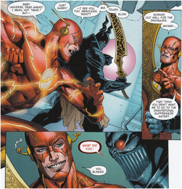 This is why so many writers choose to have Flash fight other speedsters and/or time travelers. Because every conflict would end like this. The problem with writers using that solution is that these three panels are far more interesting and entertaining than a five issue story arc where The Flash can't beat somebody because they're faster than he is right up until the moment The Flash believes he can run faster and thus does and wins.