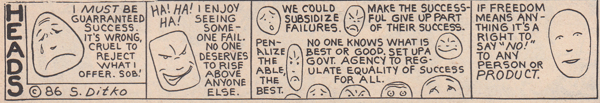 Most people can only argue philosophy in general terms like Ditko here because when you get down to the nitty-gritty details of reality, and actually have to speak on real subjects and how these ideas would play out in the society you live in, the philosophy doesn't hold any water. Ditko's arguing with Theoretical Strawmen here and tuning it, as best he can, to the idea of selling products in a capitalist society. So a four-times concussed adult reading this might think, "Yeah! I agree! If you sell Twinkies filled with shit, you deserve to fail! I don't want my taxes going to support your Shit Twinkies business!" But what's Objectivism is really saying is, "Oh? You were born poor from generations of poor people who had their wealth stolen from them and now you want the government to give you a hand out? No sir! I started a business with the money I received as an inheritance when my grandparents died so why don't you? Oh, too lazy, I bet!"