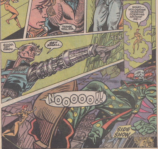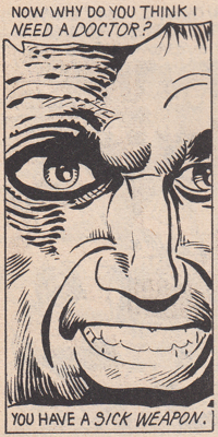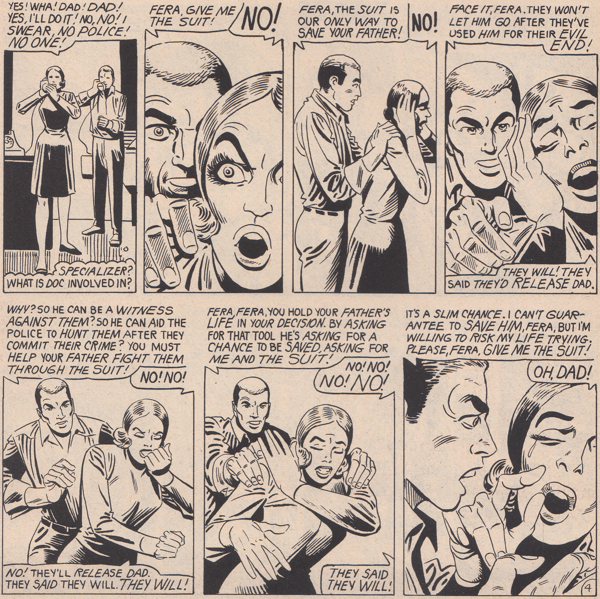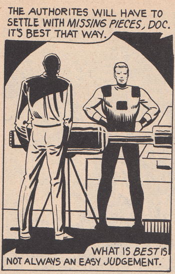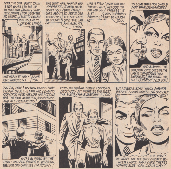The denouement portrays a scene where the Doctor wonders if he shouldn't destroy the suit because, like the gun, it could be used to commit unspeakable acts of evil. But Stac, who really, really, really fucking loves wearing the suit, tries to convince him that things aren't evil and you can't stop a new-born baby from turning evil so why not just let him keep the suit? He makes sure to throw in, as a major point of his argument, "Do gun triggers pull fingers?" Oh, wow, man! I thought Steve Ditko must be some kind of genius for all the work he's done in comics but it turns out he's just another 2nd Amendment chud with the most boring, cliché arguments that they all spew because they think in bumper stickers.