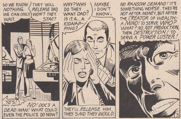 Back to the main story, Stac Rae works as an assistant to a Doctor Ed Serch who works at the Quest Research Lab. The story begins as the Doctor is being kidnapped by some men working for a mysterious The General. Stac and the Doctor's daughter Fera are currently on their way to the lab discussing, I don't know, Objectivism, probably.