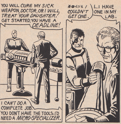 I guess Fera gives in to Stac because he follows the henchman back to The General's secret lair and he's got the suit with him. While he looks for a way inside, the Doctor learns, with the Specializer he thought he didn't need, that many of the parts in the gun are defective. If he'd just done the obvious work, the gun wouldn't have worked anyway. But now he's going to have to fix it up completely, killing millions! Maybe. Or just, like, one really irritating squirrel? It's not like the Doctor knows what The General's plans for the weapon are. He might even be serious about sending the Doctor home after the sick weapon is cured! Just because some guy calls himself The General, has half of his brain showing through his skull, and kidnaps scientists while threatening the scientist's daughter with death, it doesn't intrinsically mean he's up to no good. He's just being productive!