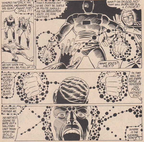 Static catches up to The General who attempts to murder Static with his newly healed gun. He fails and Static manages to turn the gun on him, ripping him in half. Static figures without the gun and their leader, his followers will just sit around unthinkingly and collect welfare. Evil but not as evil as stealing gold from wealthy people using violence. Static collects the gun and takes it back to the Doctor who will make it sick again so the world will be safe from, well, one single threat. Hooray for free will and hard work or something!