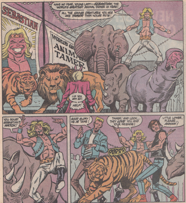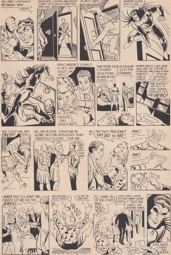 The final five page story, "Shag and the Uglies", makes absolutely zero sense. But a guy does push down a hot chick twice after she tries to slap him around. So that's cool! Or is it the opposite of cool? I'm so confused by how terrible the story was! The thrust of the story was that Jay (or "Shag" when he transforms) works security for some television variety hour. A guy in an ugly mask attacks the hot singer. Shag stops the attack but the guy gets away. Then Jay and his pals get together and go, "Let's be like Sherlock Holmes and solve this case!" And I guess they figure out who the attacker is but it doesn't fucking matter because he tries to attack the singer in studio again and is caught. So, um, what?