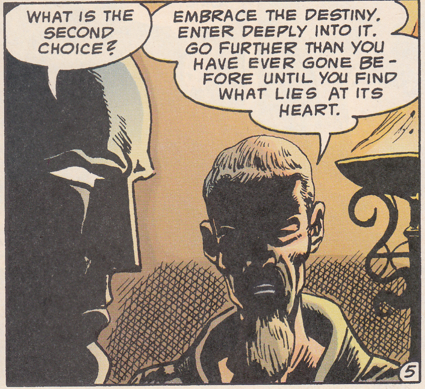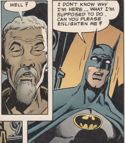Somehow, Batman fucked up his destiny by choosing violence. The Master, an old man who trained Batman many years ago, says that Batman has embraced violence too eagerly and while he has a gift for it, he warns that it will destroy him. So The Master gives Batman two choices, either embrace peace or — "I'll take the second choice!" yells Batman!