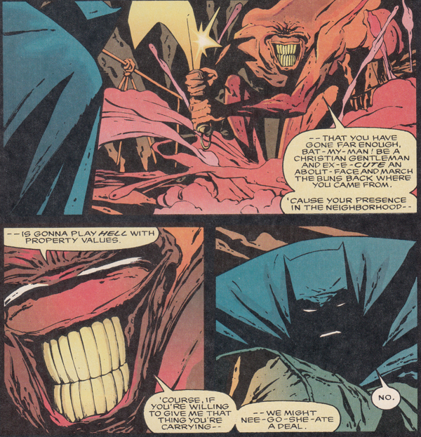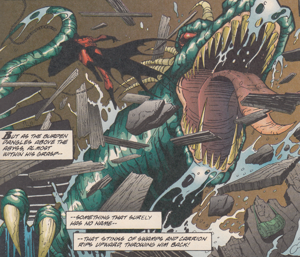 Batman encounters several devils who try to take the duffel bag from him but he beats the shit out of each one that tries and never gives up his burden. Is this a retelling of The Last Temptation of Christ? Batman never gives in but then the only thing he's been tempted with so far is giving up his heavy bag. If only David Finch or Tony S. Daniels were drawing one of these sections, Batman would be tempted by several women exiting showers and wearing only towels. He'd definitely fail that temptation! I mean, I'd definitely fail that temptation!