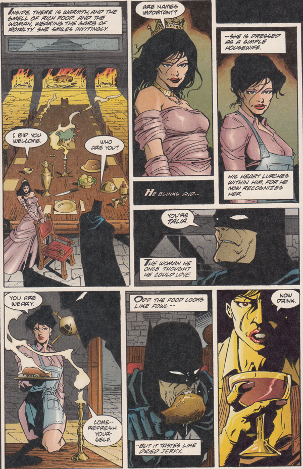 Batman discovers another door. On the other side is a world conceived of by Joe Quesada and Joe Rubinstein. He finds he has left Hell and found himself in a medieval castle. So last challenge was by Nikos Kazantzakis; is this challenge by, um, whomever wrote Sir Gawain and the Green Knight! I didn't think that sentence through to the end or I would have formatted it in a way that didn't depend on my (or anybody) knowing the author of Sir Gawain and the Green Knight.