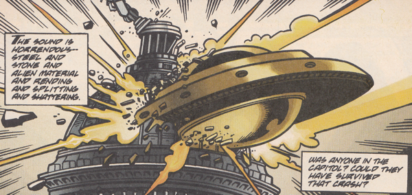 The alien tells Batman that he fucked up by crashing his flying saucer into the Capitol Building and to recover from his humiliation, he needs to kill a human in one-on-one combat. Batman doesn't want to kill him so instead he tells the alien he can just find asylum in America because in 1992, America still cared about helping people. Or maybe it didn't. But Batman did! By not killing the alien even when the alien was practically begging for it so that he wouldn't be the laughingstock of his people, Batman has passed yet another test in controlling his violent nature.
