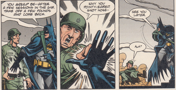 Just so you know, I don't approve of Batman fat shaming that soldier even if Batman only did it to save his life. The soldier wanted to fight the alien himself and Batman decided to choose a worse form of violence than actual violence: patting a slightly overweight guy on the stomach and hinting at how fat he's getting. Is Batman my uncle?!