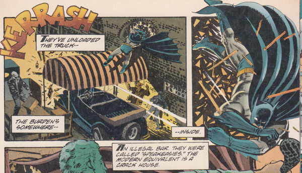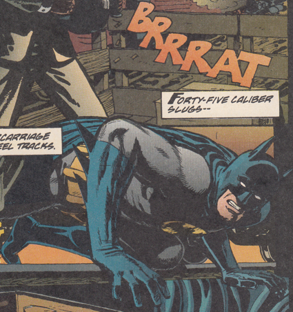 Batman walks out of the misty night and stumbles on some mobsters bootlegging. They immediately begin firing bullets out of their tommy guns at an alarming rate. You can tell because while most guns go "POW!" or "BANG!", tommy guns go "BRRRAT!" Even Batman finds it terrifying!