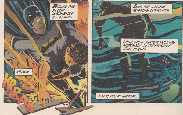 Batman finds himself in a snowy landscape. He decides, after so many tests, the best thing to do is take a nap in the snow. Sure, he's also soaking wet from the plunge in the river. But he built a fire! And his suit probably has electric blanket technology sewn into it.