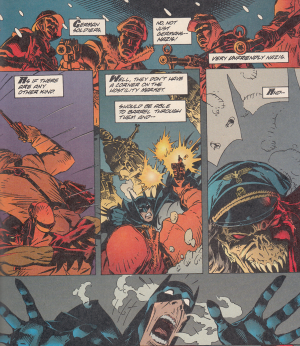 Before he can freeze to death in his sleep, Batman's awakened by the butt of a rifle in his back and being called a pig in German.
