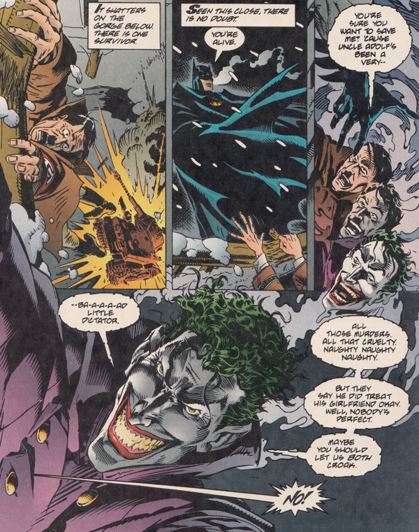 At one point, The Joker learns that Batman hallucinated that The Joker was Adolf Hitler and The Joker is all, "I'm flattered!" Which is the appropriate response by The Joker because having The Joker be all anti-Nazi and constantly trying to prove it with that bit where he's insulted by The Red Skull's Nazi affectations is stupid, useless bullshit. He's fucking crazy. He's a murderous madman. Proving that even he hates Nazis doesn't mean shit. "Oh, wow! Even The Joker hates Nazis! Well, let's applaud The Joker for having one rational belief although none of his beliefs are rational so why are you relying on this one being so?!" This, for me, is The Joker's canon response to Nazism and Adolf Hitler! He's pleased as punch to be anywhere in Hitler's league! That says more about how shit Hitler and the Nazis are than having The Joker somehow defend hating them!