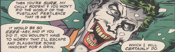 Dennis O'Neil has written the only story that matters! How far will Batman go to preserve his rule about not killing somebody? How much evil will he allow to remain in the world just so he can look Superman in the eye and say, "Well, I've never killed anybody" (and then mutter, "Technically.")? Because as we saw in The Poison Tomorrow, Batman has the capacity to think about "If somebody raises some thing or person or ideal above everything else (Green Arrow needing to save Dinah (or Batman needing to never have killed!)), then how many will die (thousands of babies (or, in Batman's case, everybody The Joker murders after every time Batman doesn't kill him))?" Surely Batman isn't responsible for every murder The Joker commits when Batman catches him but doesn't kill him. Because Batman is just following Jesus's words and ideals about redemption. And also Gandalf's!