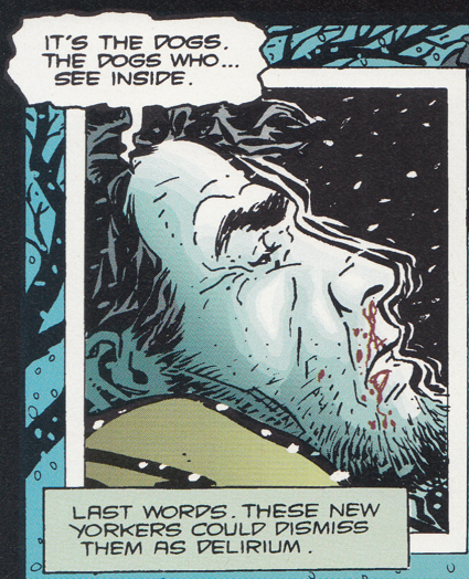 After Jones sits done, he's hassled by a Beatnik who recognizes a kindred, outsider spirit. He reads either a parody of Howl or the version of Howl written by the Ginsberg from the DC Universe. Was this guy just trying to pass off a poorer version of Howl as his own poetry? Or did Gerard Jones just want us to recognize Howl without having to get clearance for using it (and also because Howl uses the word "negro" in the first few lines which this guy is paraphrasing and maybe DC was all, "Um, nope")? I can't help but feel that Howl contains the basic theme of Gerard Jones' story now. Thousands of American lives destroyed by the status quo, by the suburbs, by the scared and easily intimidated, by the overbearing cops and inconsiderate laws, the nearly impossible to follow for some social expectations, by poverty, by racism, by Martians, by, well, you know, America?