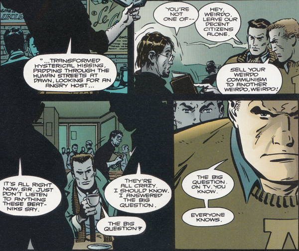 Apparently the people running The Big Question are shape-shifters trying to take over the world! Or, at the very least, the world of game shows. But this creature that can see John when he's invisible who could also take the form of the recently dead champion has a lot in common with Martian Manhunter! Except they seem to be evil so let me guess: white Martian? It also explains what happened at the café. A Beatnik who could somehow see the aliens in their true forms (because Beatniks, man, are like in touch with The Real, dig?) realized two women at the café were aliens. So they chased him out of the café and shot him with, I don't know, laser eyes, I guess? Then they shifted into two macho crewcuts and headed back into the café where they basically shit on their cover right into John's brain.