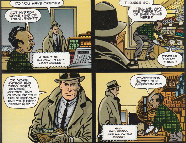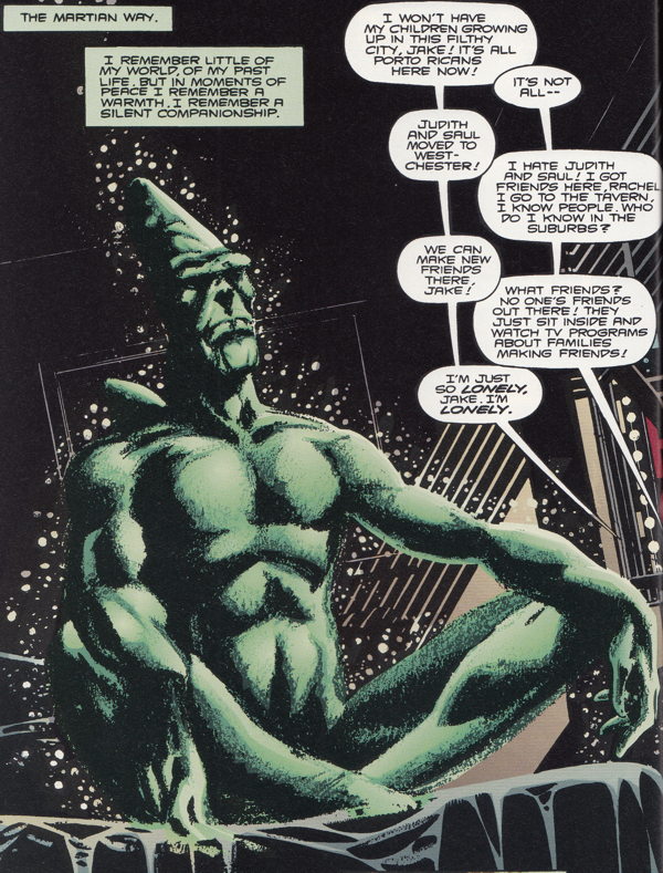 On the way back to the hotel, tired from a night of Martian investigating, Martian Manhunter learns about Hydrox cookies and capitalism.