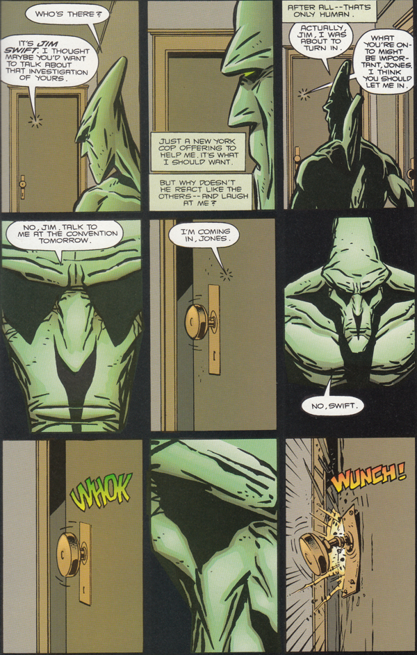 The next day, Jones attends the Forensics Conference where he learns all about how police will one day investigate crime using nothing but science! Jones tells the other guests at the conference how he's been investigating the Beatnik murder but not by following evidence at all. Instead he's been using anti-science by following hunches and references and comic books and lizard-headed people. Most of the other conference goers laugh it off but some guy named Swift is all, "Where are you staying so that I can send somebody to murder you tonight? I mean so we can discuss the dead Beatnik?" And Jones is all, "Here's my hotel and room number!" As a Martian, he's quite naïve when it comes to Earth customs like lying about your contact information and hiring assassins.