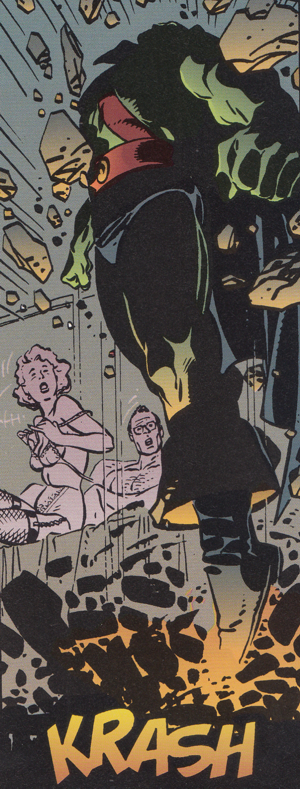 During the fight, the television is smashed and a fire starts. The lizard guys realize quickly that the fire weakens Jones. Martian Manhunter flees before they can get the upper hand, smashing through several floors of the hotel and seeing some titties on the way.