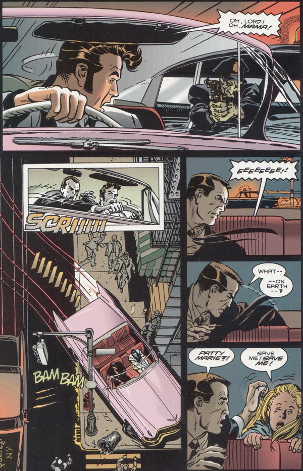 Jones confronts Phil and he spontaneously combusts. At least that's what it would look like to a detective who isn't investigating in a holistic way! Phil was probably murdered by the lizards for saying too much about Cuba to a non-lizard head! Preston Presley (or whatever his fake DC Elvis name is) runs into the office screaming about how the lizard people are all over the building. Jones points out that there's not easy way out of New York because the cops are corrupt. Preston, being the king of rock and roll Juvenile Delinquents, says, "Duh!" But Prelvis has an idea! They can take his pink Cadillac and escape! Time for the climactic chase scene!