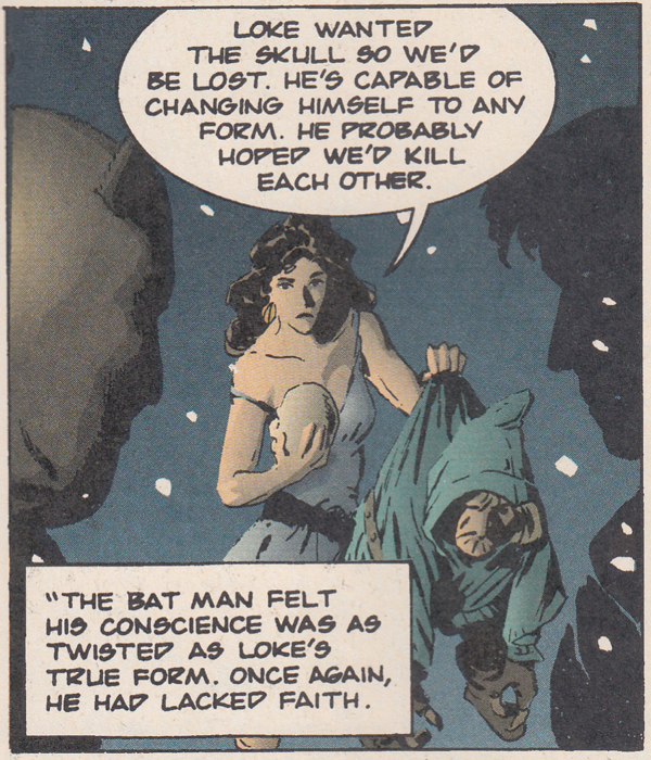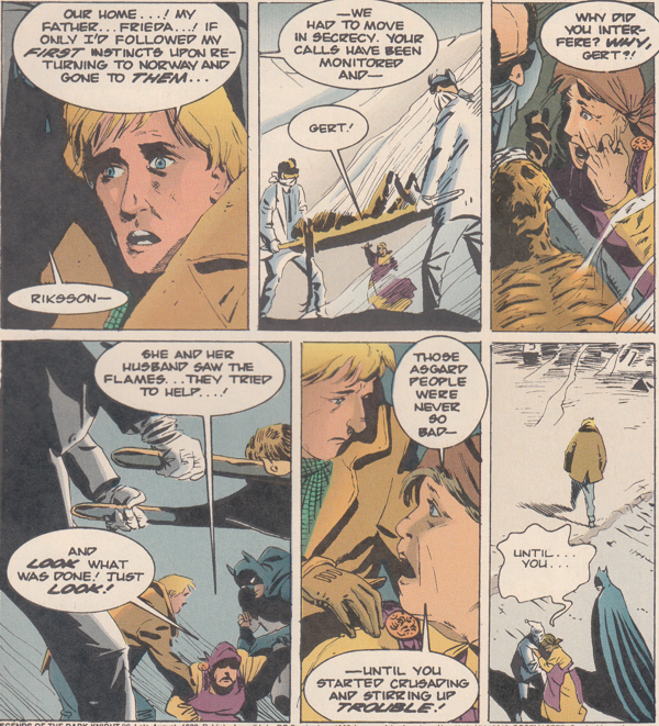 After learning nothing that would be seeming important from the book other than that they should trust each other for absolutely no reason (unless being cousins dozens of times removed is a reason), Batman and The Viking make a night-time raid on Asgard to save Viking Jon's dad and sister.