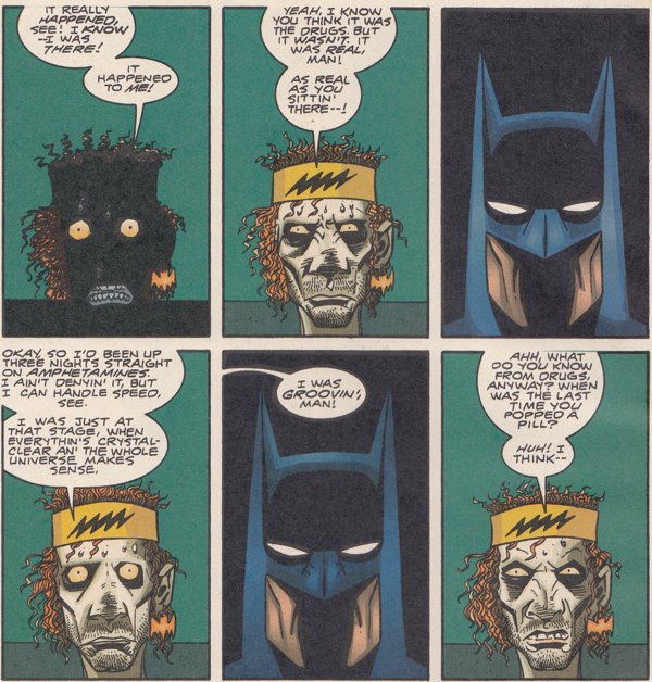 Batman doesn't pop pills. He gets his kicks once or twice a year by sucking down as much Scarecrow gas as humanly possible and then tripping his balls off while pretending he has a Viking best friend. My hypothesis is that Batman sets Crane free a few times a year just to get his fix of that fear gas.