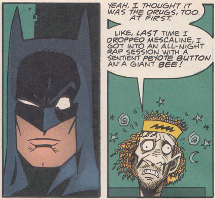 Overdog, the guy telling Batman his incredible tale which hasn't been incredible yet because he hasn't gotten to the part where he took the mescaline, tells Batman an incredible tale about robbing a drug czar and stealing all of his drugs and money and also some mescaline. He and his pales Stone and Petite Pete down tons of drugs immediately. But first they have to torture the drug lord to death so that he'll tell them where the drugs are. Batman doesn't arrive on the scene until after the guy is dead because why would Batman want to save a criminal from other criminals? He's pretty much on the record in this series as approving of criminals being killed by other criminals. Don't try to explain to Batman how some of the "criminals" being killed on the streets of Gotham are just desperately poor people who have fallen on hard times and just want to provide for their family. If you try to explain that to Bruce Wayne, he'll stick his fingers in his bat ears and yell, "La la la Ayn Rand Ayn Rand la la la!"