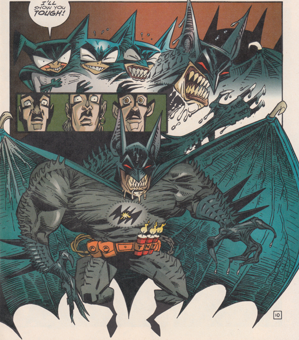 Overdog runs into some friends with guns and asks them to murder Bat-Mite in exchange for some of his new stash of drugs. They pull out their guns faster than you can say, I don't know, how fast can people pull out guns? I don't want to say a phrase that doesn't ring true to people who know exactly how fast a gun can be pulled out. What I'm trying to say is they really fucking want some drugs so they all start shooting Bat-Mite. But Bat-Mite, being an imp from the fifth dimension, is basically a Looney Tunes character. So instead of being riddled full of holes, he turns into a monster.
