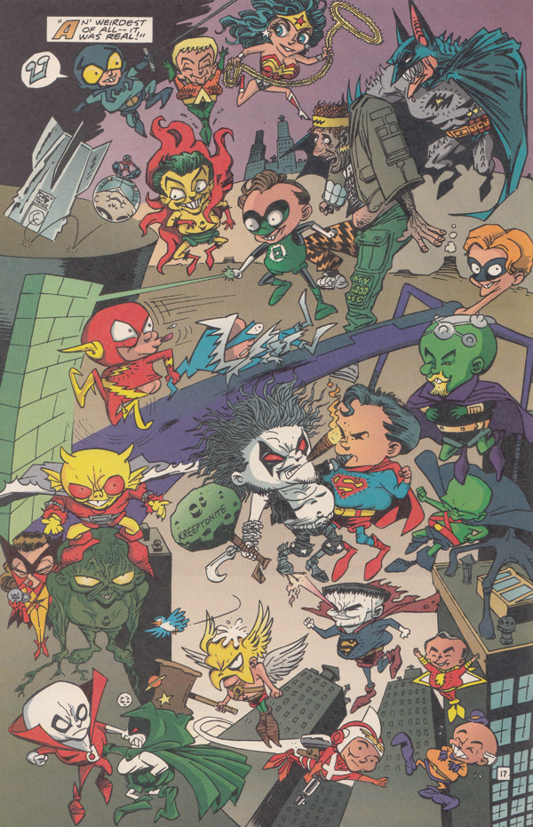 What follows after Bat-Mite turns into a monstrous demon are several pages of absolute 2000 AD-inspired gore. Using Men-in-Black tactics, Bat-Mite lets Overdog live to take the blame for the murders. He also somehow manipulates space-time so all the people killed horrifically by him were later seen as having been shot with regular old bullets. I say "somehow" because how else am I supposed to grasp or explain the powers of an imp from the Fifth Dimension? I can't even comprehend a tesseract from one dimension lower!