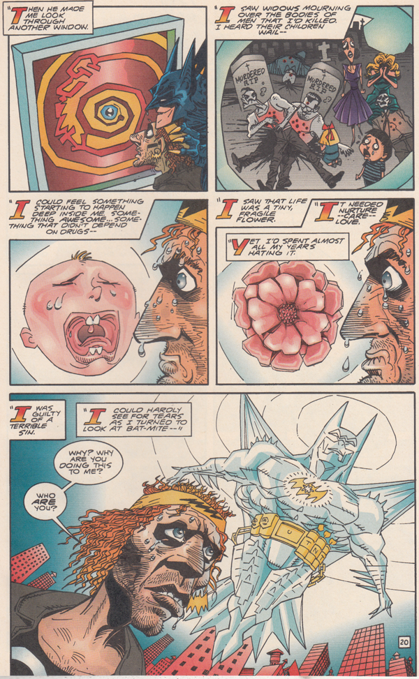 Overdog represents and as he apologizes profusely, he comes down out of his drug-induced paranoia and sees Batman approaching. He promises to never hurt anybody ever again. Batman turns him over to the police where Overdog faces trial and winds up committed to Arkham Asylum. That's where Batman is interviewing him. But no matter how much Overdog pleads with Batman to be lenient and how much he convinces him he's repented of his ways, Batman, a true bureaucrat, shrugs his shoulders and says, "Nothin' I can do, buddy! Court decided it. You're crazy, mate!" And so Bob Overdog is left to rot in Arkham Asylum never to be heard from again. Except for when he returns in Batman: Mitefall. I don't think I own that. I'd better keep an eye out for it!