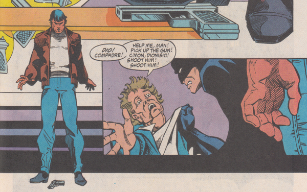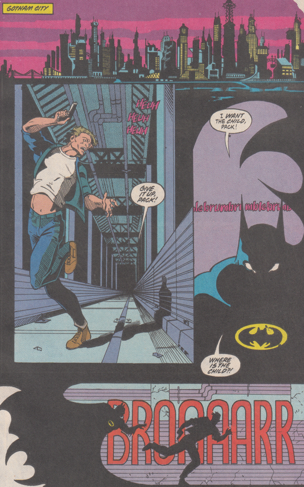 Batman threatens Dio simply because the man he's been chasing all night knew him by name. When people say ACAB includes Batman, that ain't no joke. It doesn't help that Batman recognizes the guy as somebody he once put in prison. Batman says, "You were working for The Riddler." But the guy is all, "Naw, the Penguin." I bet Batman got that wrong on purpose to test the man's honesty. He claims he's on parole and going to see his parole officer and only knows Pack from the hood. But Batman is all, "I'm looking for a kidnapped child and this guy knows something and he knows you so I'm going to assume you know something. So look out, scuzzball." And Dio walks off thinking, "What the fuck? Am I in a Judge Dredd comic book?"
