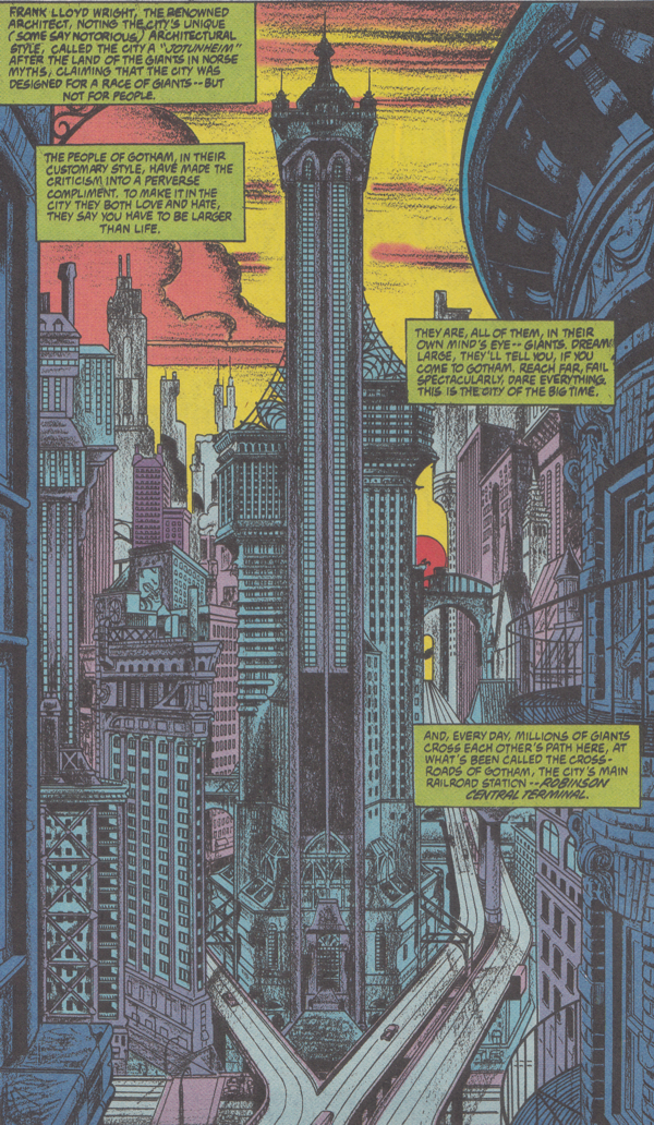 The real story begins with several pages describing Gotham City, it's architecture, and how it has affected and shaped the people living there.