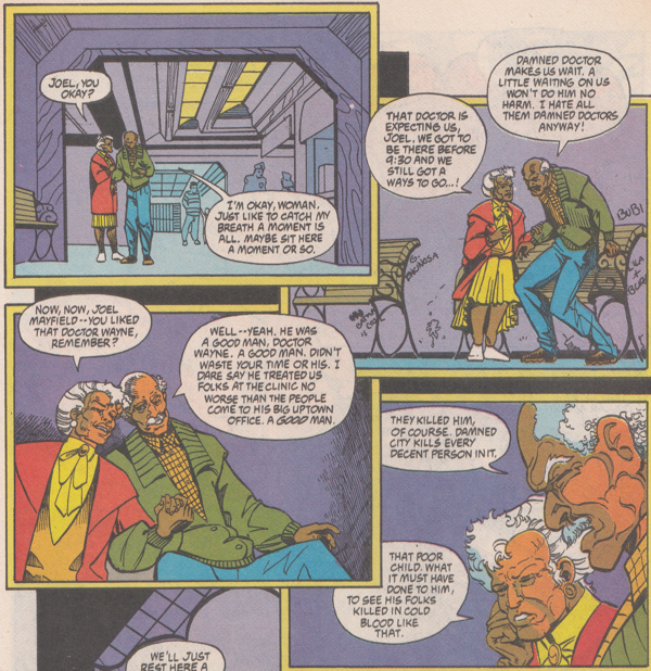 I guess the main takeaway from page one though is that maybe this is a story about Batman. Maybe I shouldn't have judged the cover by the cover. Maybe the "BATMAN" at the top should have been more believable than the shit in the sidebar that really seemed to be added because editorial read the script and was all, "Batman isn't really the focus of this, is he, John?" And John Ostrander was all, "No, of course not. How interesting is that? Who can write a Batman story in this day and age with any new and interesting facets?! It can't be done!" And editorial was all, "Well, it had better be done because people aren't going to buy a Batman book without Batman." And John Ostrander was all, "I mean, look. This is obviously a Batman story! I'm just going to focus on how he interacts with the people he's obsessed with keeping out of harm's way! And their confusing relationship with the city, knowing that one desperate move by any of them could wind up in two broken arms, a broken leg, and a fractured spine. This guy's like Javert on a constant overdose of amphetamines!" Then editorial was all, "Whatever. Just make sure it's got enough Batman that nobody complains. We want zero letters from angry dorks over this, understand?!"