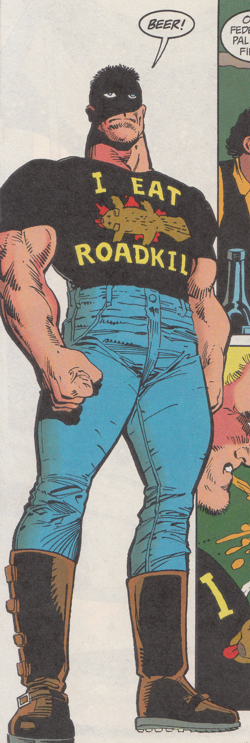 I feel sorry for The Ugly American simply because he's being dressed by Dan Jurgens. Can the waist of his pants be any higher? Is eating roadkill a stereotypical American pastime to be proud of? Did he swallow a brick just before entering the bar?
