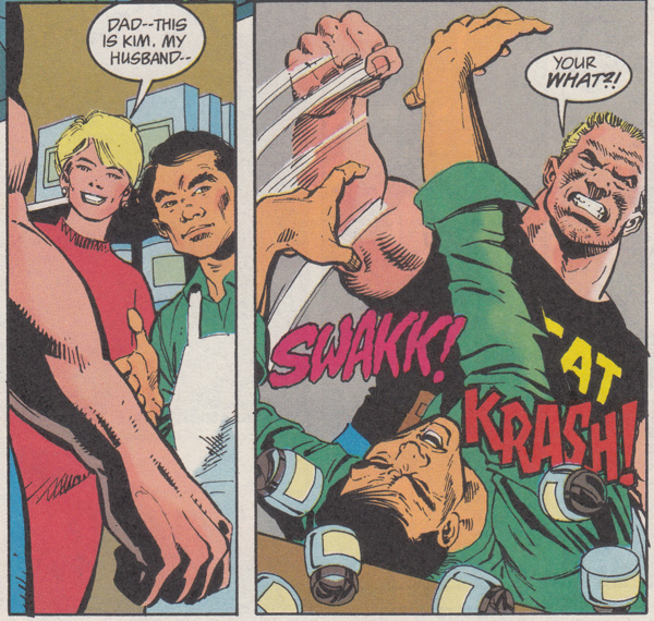 Luckily Payne's too stupid to make the connection that his daughter married a Korean and she's also pregnant. So the baby stays inside Tina for now instead of being ripped out and stomped into a bloody smudge on the pavement next to Rodrigo. I assume he understands what sex is and its consequences so it's lucky that Batman arrives just in time to stop a fun little comic book infanticide (she looks to be nearly nine months pregnant so I'm going to go ahead and assume that the baby can, with proper care, survive outside of her womb at this point. If she was only a few months in, I'd have said "a fun little comic book abortion" instead of "infanticide". Duh!).