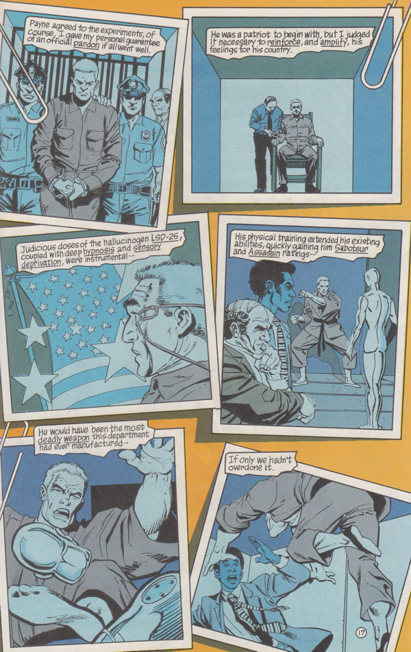 Once he was officially declared dead, Payne was entered into a program of propaganda, LSD, and high-level murder techniques. Once they were threw, he was the perfect patriot: a complete and utter racist piece of shit.