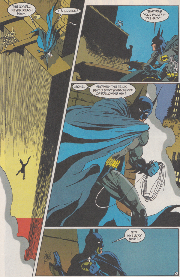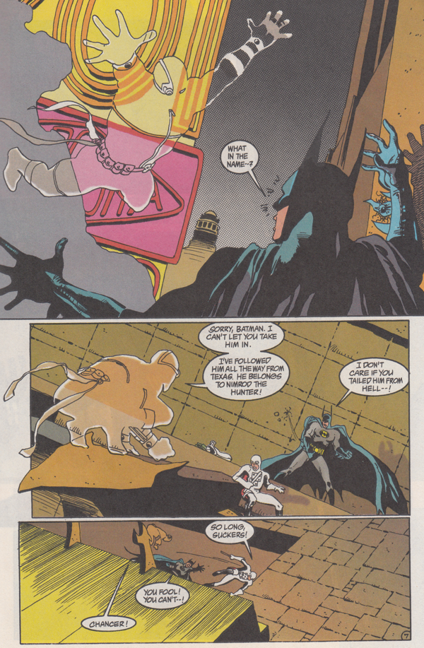 Chancer uses Nimrod's distraction to get away by leaping off the edge of the multi-story building's ledge they were battling on. Batman presumes to his death.