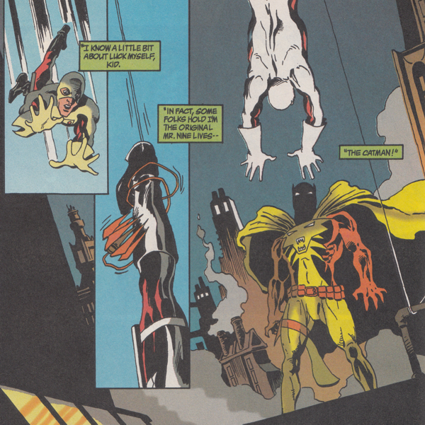 Chancer's life is saved by Catman who catches him by the ankle with a wire trap. I know what you're thinking: "Must have ripped his leg clean off!" No, no. I don't think G-forces caused by deceleration exists in comic books (or acceleration according to Flash comics when he just grabs people at super speed to get them to safety). As long as a person is stopped instantly by something other than concrete, they're gonna be okay. Plus, Chancer has the luck of the number nine on his side! Which Catman passive-aggressively comments on.