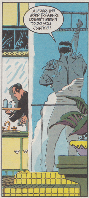 Meanwhile Calendar Man sets up some bombs or Polaroids or traps or something around the building where a charity event with the Mayor and Commissioner Gordon will be taking place on Wednesday. Obviously this is the scam mentioned by Catman since Officer Nobody mentioned the event in passing to Batman. Calendar Man obsessively quotes an old nursery rhyme about telling the fortunes of a child based on the day of the week they're born. I guess Alan Grant had to come up with something thematically interesting that he could be obsessed with other than just the names of the months or numbers no greater than 31. I wonder if he's also obsessed with pin-ups and cute kitten and puppy pictures?