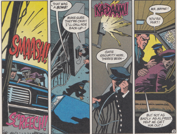 On a side note, why the fuck wasn't Alfred wearing his seat belt? I suppose a man irresponsible enough to raise a child who needs therapy by not giving him therapy and instead allowing him to travel the world to learn the deadliest martial arts only to return home, don a Furry Costume, and get his kicks beating the shit out of criminals probably isn't the kind of person to wear a seat belt.