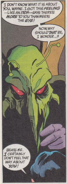 Killer Moth, knowing he's an absolute loser among losers in Batman's catalogue of villains, decided to team up with some other all-time great losers. Too bad Alan Grant didn't have as huge a boner for Killer Moth as Tom King did for Kite Man or else Killer Moth could have had a popular resurgence in the early '90s. Hell, maybe he did! I barely read any Batman comics and I certainly didn't give a shit about Killer Moth. I know I should have. I could have been the coolest and most indie nerd at the nerd table in the lunch room (this metaphor doesn't work so well seeing that by 1992, I was in college) by declaring Killer Moth my absolute favorite Batman villain. "Did you guysh know that Killer Mosh figured out Batman'sh identity before even The Joker?" Then some other kid who was keen on being King Nerd would be all, "*snort* Like The Joker ever even really wanted to know Batman's secret identity actually." Then I would have had to scramble to get back the power and, amid scraps of chewed tater tots, spit out, "Killer Mosh wash alsho the reashon Babsh Gordon became Batgirl!" And just to make sure everybody knew how indie and cool I was, I would use my coup de grĂ¢ce: "Wedge Antillesh ish my favorite character in the Shtar Warsh shaga!"