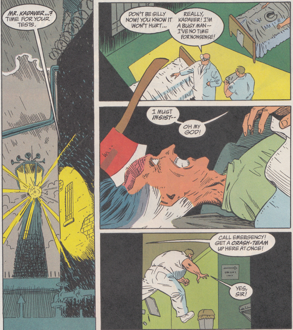 Last issue, the owner of the scary haunted castle was named Macabre. This issue begins with a guy with an axe in his head named Kadaver. I guess coming up with the name Zsasz burnt out Alan Grant's imagination for names. To top it off, his first name is Mortimer. You know! Morte? Death! Hmm, is this more clever than I'm giving Grant credit for? (Also, did Grant even come up with this character?!) Of course the big twist here is that Mort Kadaver isn't actually a cadaver; he's faking the whole axe in the head incident. He and his buddy, Jan Bodie (a Lennie Small type), have concocted this great prank to allow them to escape from prison disguised as a doctor and his patient. It works easily enough since Blackgate apparently only has one guard between the prison hospital and the exit. It's not long (four pages) before they're on the road in a prison van and speeding off to freedom. But they have nothing to do with The Human Flea. That's a whole second story happening in this issue. Two stories in one issue?! It doesn't seem plausible! Oh, that's because it isn't. "The Human Flea" is a two issue story!
