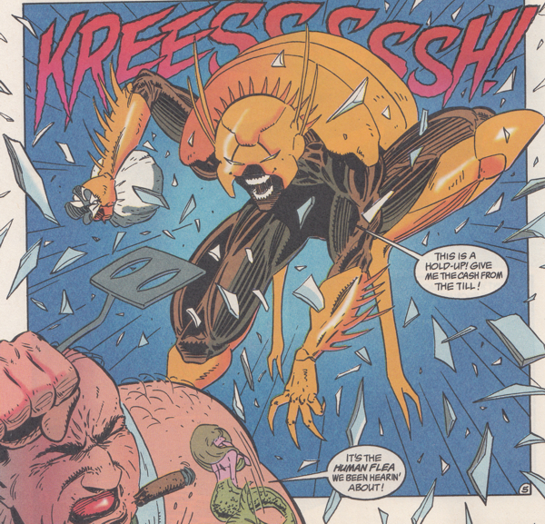Sorry I'm being so judgmental about this guy's choice of persona but fleas are gross. Not as gross as Ticks but at least they're funny. I guess? God, I wish Alan Grant could have made this guy The Human Pubic Louse.