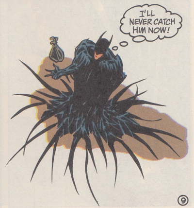 After coming to terms with the idea of a human flea, Gordon discusses the prison escapees with Batman. Apparently Kadaver was recently shot by The Penguin and discovered to have an inoperable brain tumor. He'll be dying any day. Gordon can't understand why a dying man would escape prison instead of spending his last awful shitty days behind bars. Um, is Gordon okay? How come he suddenly doesn't fucking understand anything about reality? A dying man wants to be free to die on his own terms? Shocking! A criminal dressing up as an insect? Unheard of!