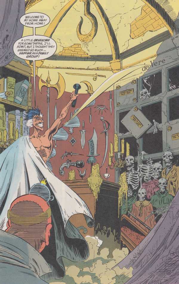 Oh! Remember there's a second story unfolding here! I guess Grant knew a story about a guy dressed as a flea wasn't going to fill much space so he added the story of Mort Cadaver escaping from prison with his forced accomplice Jan Bodie. They've fled to Mort Cadaver's secret lair: the de Vere mausoleum in the middle of a cemetery. Does "Vere" have something to do with "truth", as in "veritas"? I would know for sure if I had a friend who spoke French. But I don't know for sure because online translators, while never being great, have become utter garbage. Just tell me if "vere" means anything in the language I chose! Stop trying to detect other languages! Stop trying to autocomplete entirely new words! Why must every user interface experience assume that the user is a toddler with severe brain damage who's also extremely lazy and needs everything done for them?!